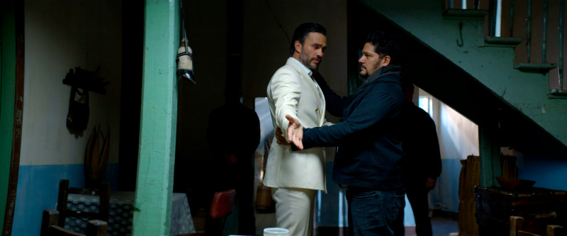 Кто там ещё? Хуан Пабло Раба самоотверженно придуривался в роли этого президента Венегаса. Роль чисто сценарно - предельно идиотская, но тут тоже надо отдать должное актёру - он действительно старался отыграть всё по полной, чем и заслужил наше уважение. Равно как и Мартон Чокаш, который этого командира наёмников сыграл так, что его вместе с наёмниками сразу захотелось нанять, чтобы они разобрались с обнаглевшими соседями по кондоминиуму.