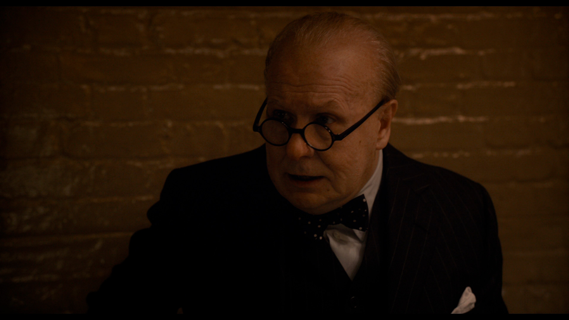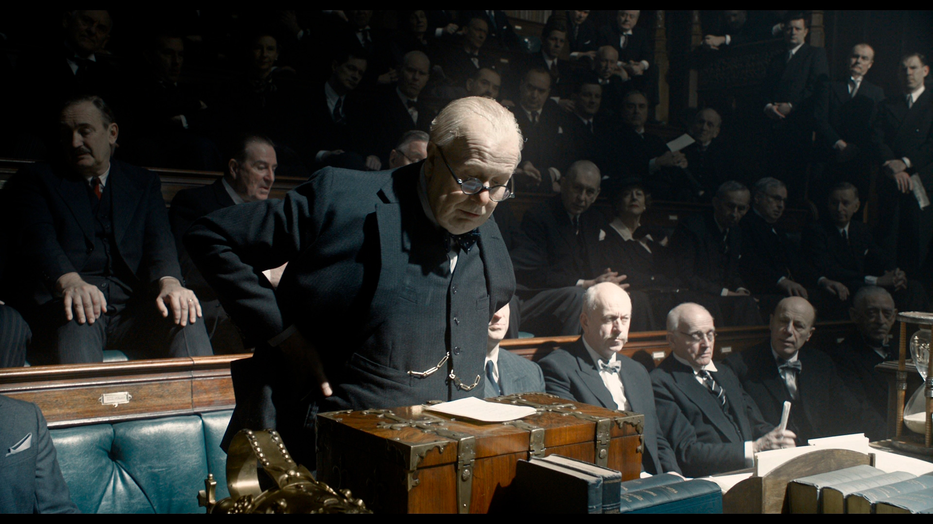 Как известно, Олдман отказался сильно полнеть для исполнения данной роли - чай, не Кристиан Бэйл, который запросто с собой проделывает подобные трансформации, - поэтому грузность Черчилля - это именно мастерство гримеров. И это все, разумеется, очень сильно усложняло задачу Олдману, потому что попробуй сыграть известного всему миру человека, когда ты на себе таскаешь несколько увесистых накладок и когда у тебя на лице - тонна грима.