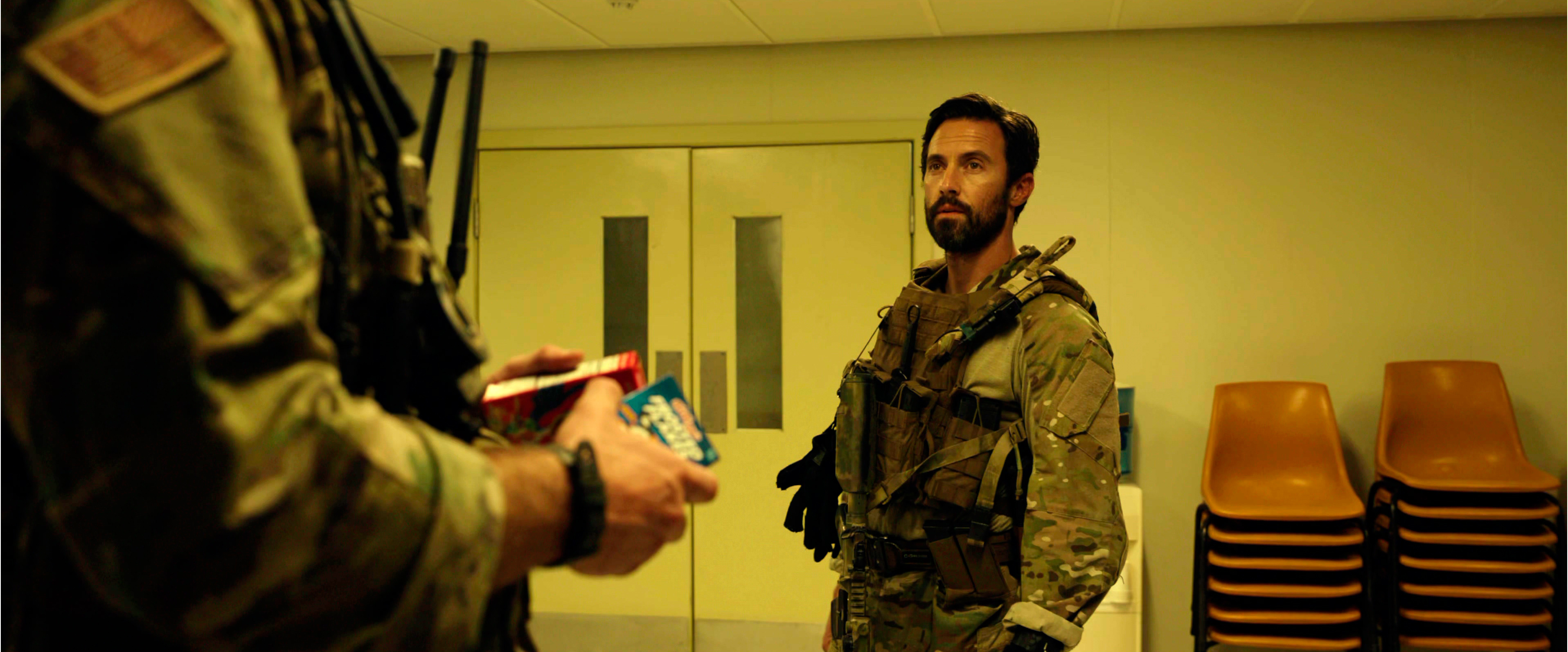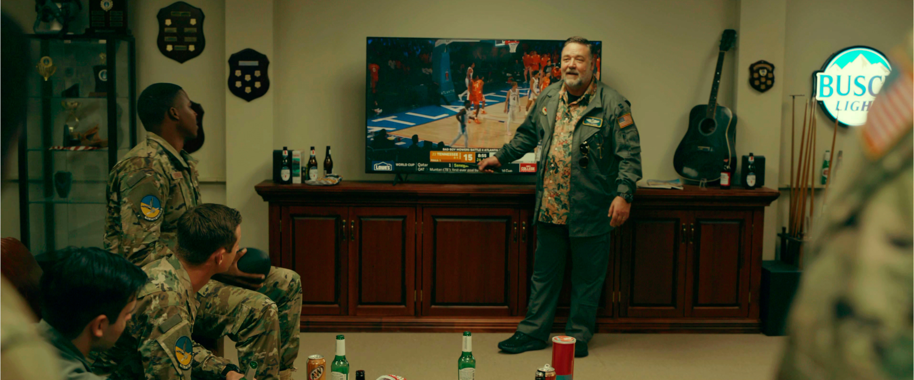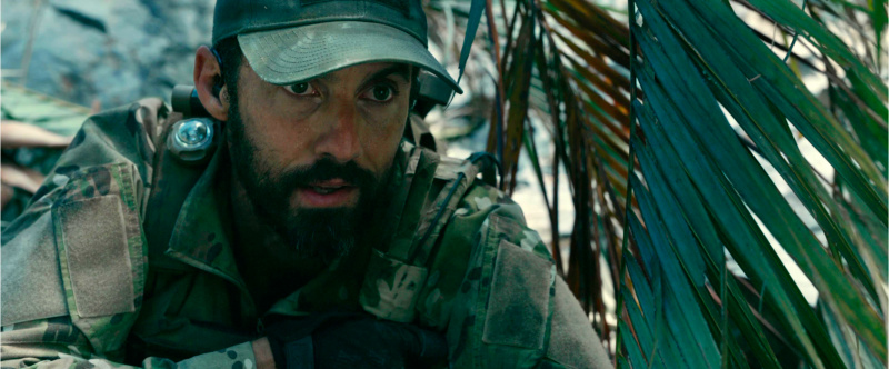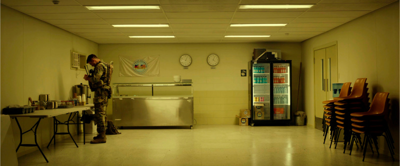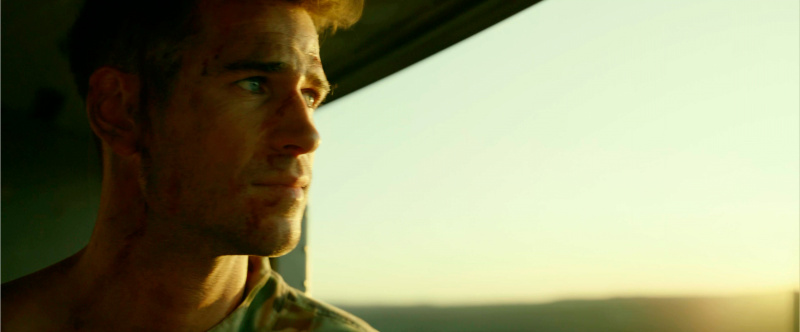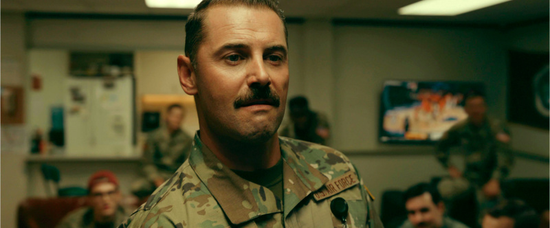 Кстати, какие-то критики считают идиотской сцену параллельного монтажа, когда оператор Эдди в огромном супермаркете покупает новый веганский копченый сыр с лесными орехами и ферментированными кешью на растительной основе и тахили, а нам параллельно показывают, как в этот момент Джей Джей Кинни пытает в каком-то подвале араб-террорист, - но мне наоборот понравилось, как это сделано, потому что оно и в жизни наверняка так бывает, когда солдат на задании проходит все круги ада, а оператор дрона после смены идет покупать какую-нибудь фигню, а потом сидит с банкой пива перед телевизором и смотрит бейсбольный матч.