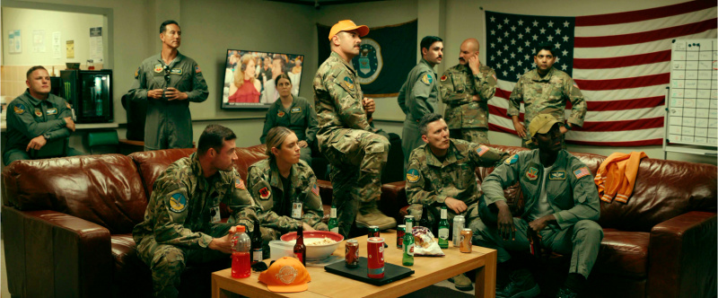 Связь с отрядом с базы держат оператор дрона MQ-9 Reaper капитан Эдди Гримм (Рассел Кроу) и его помощница сержант Ниа Брэнсон.