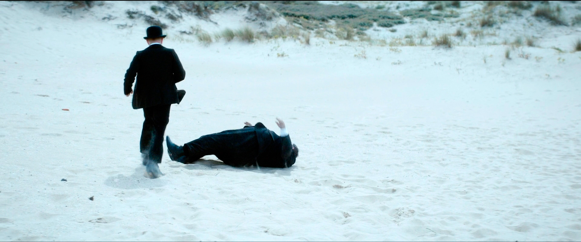 Спуск по дюнам инспектор осуществляет самым простым для себя способом: перекатываясь на боку, как колобок. Для осмотра места происшествия ему приходится падать, потому что наклоняться он не может.