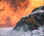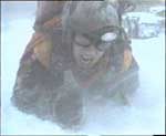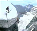 Что интересно, в фильме почти все так и получилось, за исключением того, что спасал не муж жену, а брат сестру. Но это сути дела не меняет. Был там и богач, который упорно вел всех к гибели, и альтруисты, которые все погибли, и висюльки на веревке с криками "обрежь меня" и так далее, и тому подобное. Короче говоря, стандартный набор трюков для подобного фильма. Правда, у сценариста возник неожиданный светлый взлет технической мысли. Дело в том, что братишка надумал потащить с собой в горы на 6000 метров капсулы с нитроглицерином, чтобы взорвать снег, засыпавший сеструху с плохим миллионером и проводником.