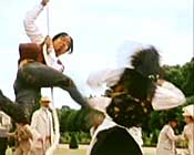 Ну и камео - целый ряд отличных эпизодов. Во-первых, Арнольд Шварценеггер, сыгравший похотливого и нарцистичного турецкого принца Хапи. По иронии судьбы это может быть последней его киноролью. Но она получилось очень забавной, вы не пожалеете. Во-вторых, Ивен Бремнер, играющий детектива Фикса. Очень яркий и по-хорошему совершенно буффонадный персонаж. Я очень пожалел, что они Фиксу сделали так мало эпизодов - Бремнер в его роли смотрелся просто отлично. В-третьих, сам Саммо Хунг в роли предводителя отряда "Десять тигров". В-четвертых, Роб Шнайдер в неожиданно ярчайшем эпизоде встречи Фогга с американским бомжом. В-пятых, Джон Клиз, сыгравший в мельчайшем эпизоде лондонского "бобби". В этой роли, признаюсь, нет ничего особенного, но появление Джона Клиза, легендарного "Монти Пайтона", - это праздник сам по себе. В-шестых, братья Уилсоны, которые повеселились над братьями Райт. Ну и, в-седьмых, великолепная Кэти Бэйтс, сыгравшая всего-навсего английскую королеву.