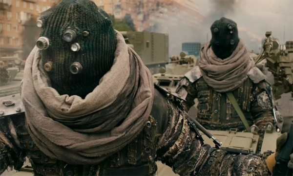 С так называемыми "клонами" Сарик вообще напрягаться не стал: обычная массовка по тыще в день, облаченная в обычный армейский камуфляж, который можно купить в любом военторге, а об их клоновости говорит только то, что на головы у них натянуты черные "балаклавы" без прорезей для глаз, а вместо глаз торчат такие трогательные объективчики - то ли от микроскопов, то ли такие китайские длиннофокусники для смартфонов - в общем, выглядело это щемяще просто до слез. Тем более что объективчики подобрали всякие разные и у одного клона их было аж семь, у другого всего четыре - в общем, обнять и плакать.