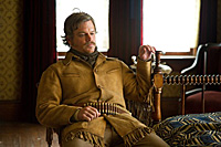 И у Бриджеса - вот это Когберн, это я понимаю. Крепко пьющий пофигист, не боящийся ни бога, ни черта, который давно понял, что лучше убивать по заданию правительства и получать за это деньги, нежели убивать по каким-то другим причинам и потом болтаться на виселице. Мутный взгляд единственного глаза, грязная шляпа, сальные волосы, манера разговора, как будто с кашей во рту, при этом Когберн, которому все-таки не хватает общения, любит рассказывать какие-то истории из своей жизни, которые кажутся одновременно и совершенно фантастическими, и тем не менее достоверными.