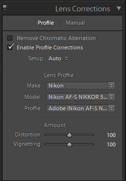 В разделе Lens Corrections очень желательно включить опцию Enable Profile Corrections: в этом случае программа на основании информации об объективе из EXIF подберет его профиль и применит к снимку - в результате будут исправлены хроматические аберрации, геометрические искажения и виньетирование. Это всегда имеет смысл делать.