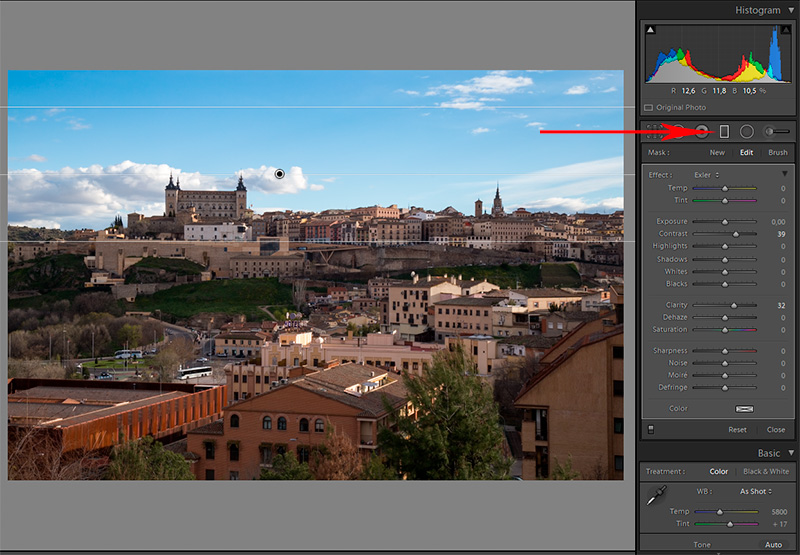 Еще один способ подконтрастить облака и небо - прямоугольный прозрачный градиентный фильтр. Инструмент вызывается справа сверху. Фильтр мышкой накладывается на область неба.