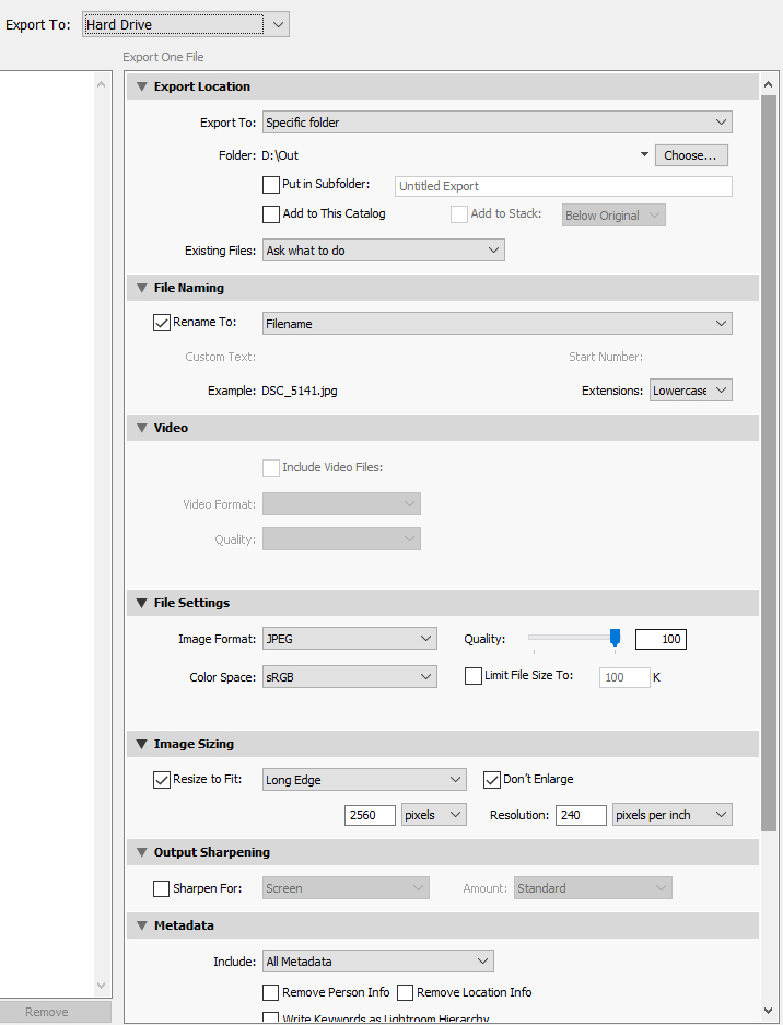 После того как фотография отредактирована, вам ее нужно будет сохранить в готовом виде. Для этого существует команда Export (Ctrl+Shift+E). Вы выбираете, в какую папку делать экспорт, как переименовывать файл, в каком качестве его сохранять, делать ли уменьшение кадра, какие данные EXIF там сохранять. Для публикации в Интернете я обычно уменьшаю кадр до 2560 пикселей по ширине.