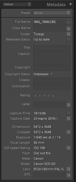 В правой колонке можно раскрыть закладку Metadata - там будет выводиться полезная информация о фотографии из EXIF.