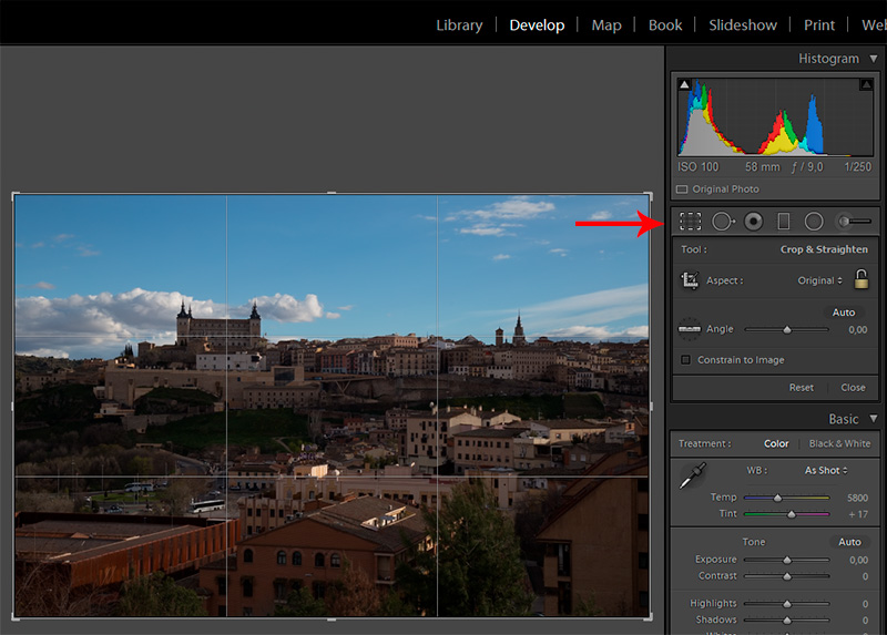 Режим кадрирования - значок слева сверху на панели инструментов. Фото при этом снабжается сеткой по золотому сечению, которая помогает корректировать композицию. Ползунок Angle - поворот изображения. Иногда помогает нажать там Auto - в достаточно простых случаях (заваливание горизонта или здания) вполне корректно выравнивает кадр.