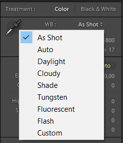 В сложных условиях освещения баланс белого необходимо корректировать. Для этого есть соответствующая секция панели инструментов, и там есть выпадающее меню, где можно выбрать соответствующие условия съемки (это для RAW, для JPG только "как есть" и "авто").