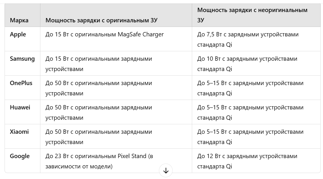 OnePlus, Huawei, Xiaomi: Некоторые модели этих производителей поддерживают быструю беспроводную зарядку мощностью до 50 Вт при использовании оригинальных зарядных устройств. С зарядными устройствами стандарта Qi мощность зарядки обычно составляет 5–15 Вт.