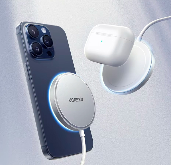 Вот, например, магнитная беспроводная зарядка Ugreen, поддерживающая стандарт MagSafe, заряжающая с мощностью 15 Вт.
