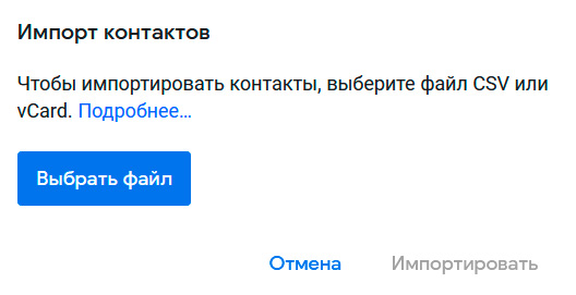 Далее в браузере заходите в ваши контакты GMail. Там нажимаете "Импорт контактов". Выбираете файл, сохраненный из iCloud, нажимаете "Импортировать". И они прекрасно перенесутся.