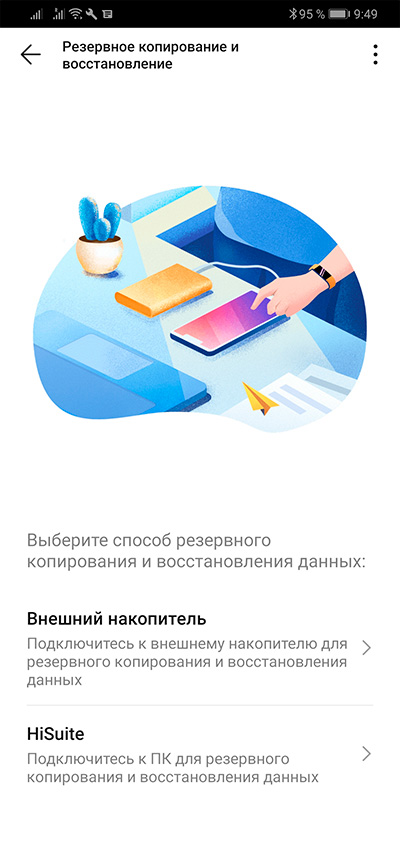 Например, у Huawei это опция в настройках "Резервное копирование Huawei". Там можно выбрать сохранение на внешний накопитель или на ПК (с помощью программы HiSuite).