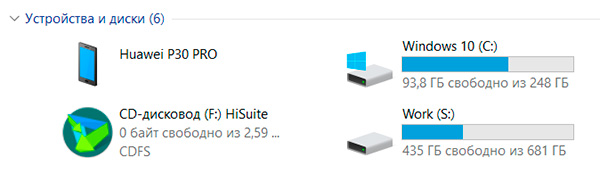 На ПК смартфон появится в виде отдельного устройства (у некоторых производителей также появляется дополнительный диск, с которого можно установить клиента для ПК, - вот в данном случае это диск с HiSuite), по нему можно щелкнуть - и получить доступ к внутренней памяти и карте памяти (если она вставлена).