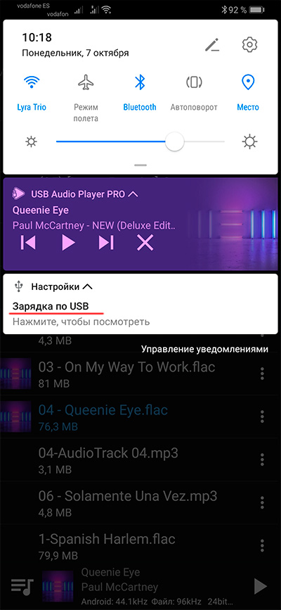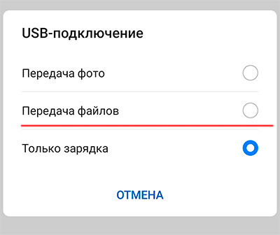 Чтобы открыть доступ, нужно зайти в область уведомлений (смахнуть от верхнего края экрана), там найти настройки подключения по USB.