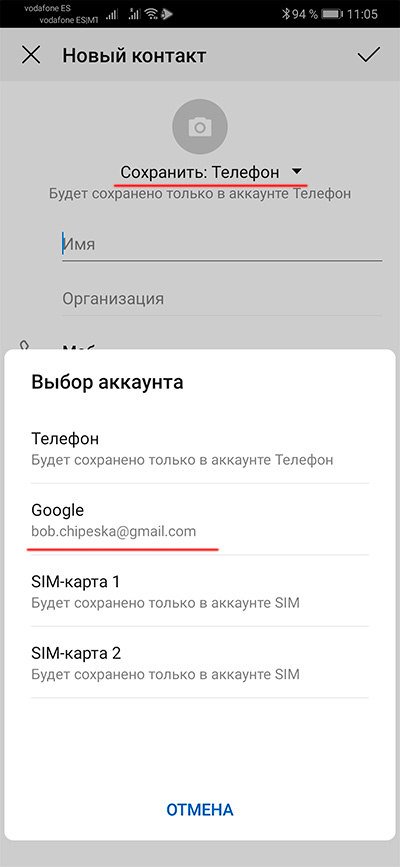 Как это проверить? Зайдите в приложение "Контакты" и нажмите плюсик, чтобы добавить новый контакт. Прямо сверху будет показано, куда этот контакт добавляется - обратите внимание, что по умолчанию указан телефон. Там нужно нажать на стрелку рядом с "Сохранить" - появится выбор. И вот там нужно указать вашу гугловскую учетку, а потом сохранить тестовую запись, чтобы система запомнила выбор.