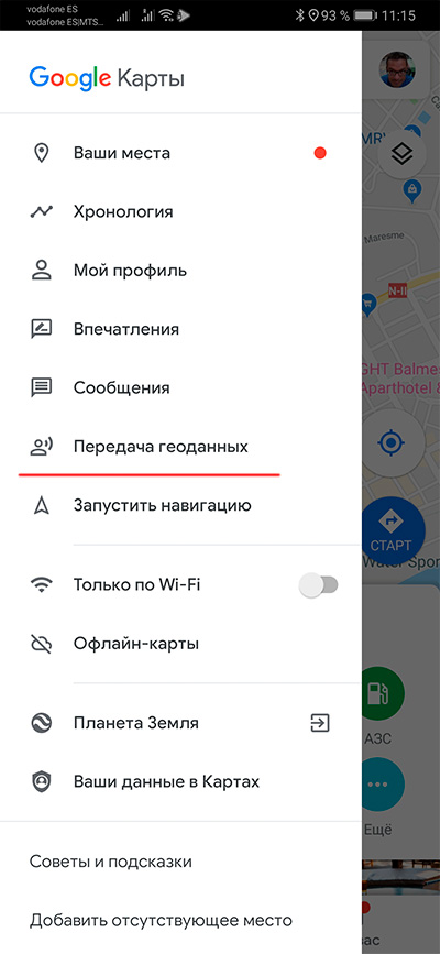 Также в картах Google, которые здесь значительно более продвинутые, чем аналогичное приложение под айфон (там возможности очень сильно урезаны), есть пункт в меню "Передача геоданных".