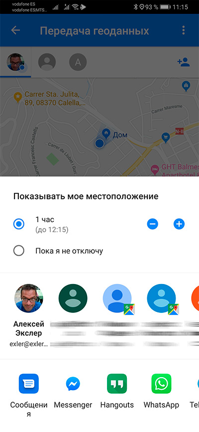 Там вы выбираете абонента из контакт-листа и разрешаете ему отслеживать ваше местоположение в течение какого-то времени.