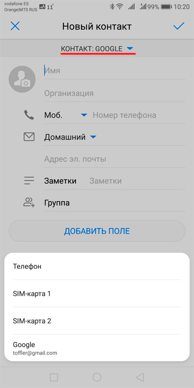 И добавляя первый раз новый контакт в смартфон, обязательно проверяйте, в какую именно учетную запись это будет добавлено (вам всегда это показывают). Один раз выберите учетку Google - и все, на эту тему больше можно и не думать.