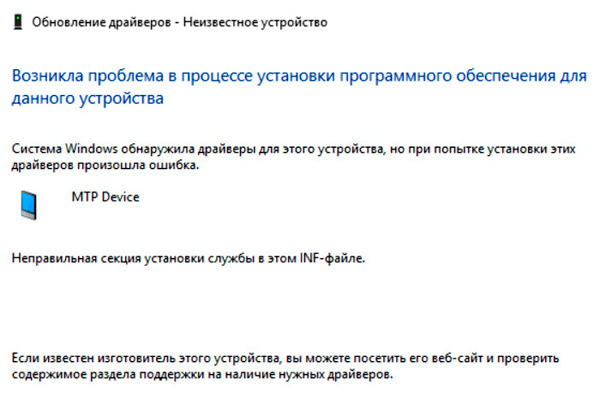 Если вы, увидев в "Диспетчере устройств" значок смартфона с желтым треугольником, попытались при этом обновить драйвер с автоматическим поиском, то с высокой долей вероятности после этого получите вот такое сообщение.