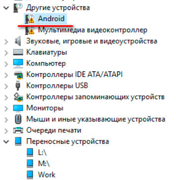 Подтверждение этому тезису вы найдете, если зайдете в Панель управления - Диспетчер устройств - Переносные устройства. Там наверняка в списке будет значок с названием смартфона, на котором размещен предупреждающий желтый треугольник с черным восклицательным знаком. Это как раз и означает, что для устройства не установлены правильные драйверы.