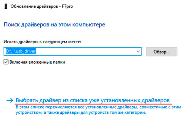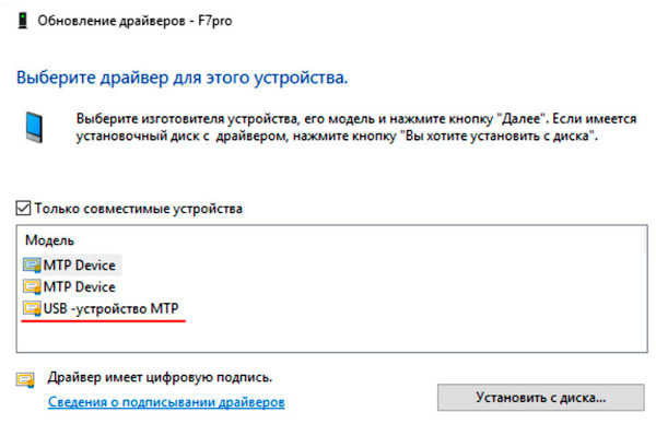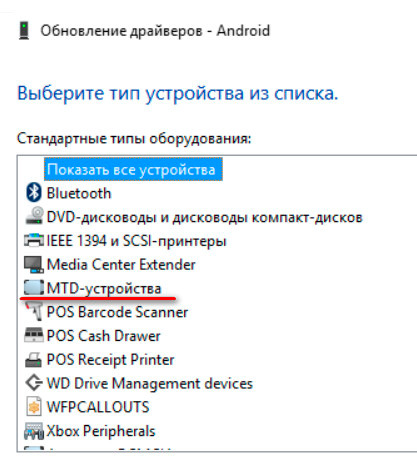 В этом случае также нужно произвести вышеописанные действия, вот только после вызова драйвера из списка установленных сначала надо будет выбрать MTD-устройства, и только после этого появится соответствующий список, в котором нужно выбрать USB-устройство MTP.