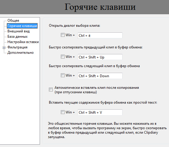 Тут самое главное - выбрать комбинацию клавиш, вызывающую основное окно ClipDiary. Лично я использую комбинацию Ctrl+` (она же Ctrl+ё).