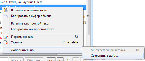С любой записью буфера обмена можно сделать следующее: вставить в активное окно, скопировать в буфер обмена, скопировать как простой текст, вставить как простой текст, переименовать, удалить, сохранить как файл.