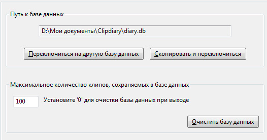 Важный момент в настройках - путь к базе данных и, самое главное, размер этой базы данных. Дело в том, что по умолчанию программа хранит в базе аж 1000 последних клипов (записей). Если там большинство из них - картинки, то размер этой базы данных может быть очень даже немаленьким. Поэтому для контроля базы и ограничения ее размера задайте путь к базе в какое-нибудь легкодоступное место (например, в "Мои документы"), а количество сохраненных клипов ограничьте максимум сотней клипов.