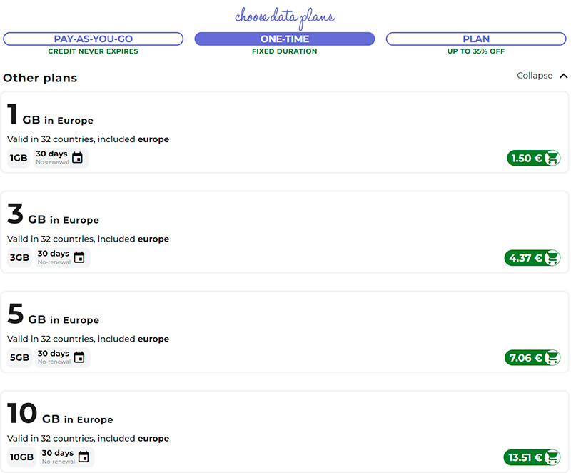 Например, по всей Европе в течение 30 дней - 10 ГБ за €13,51, то есть всего €1,35 за гиг, что реально дешево.