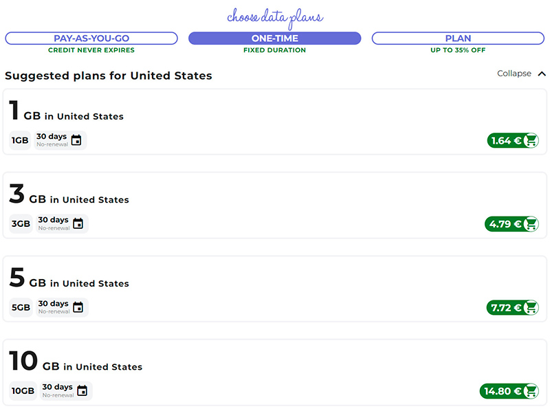 Вот, например, Испания - фиксированные планы. 10 ГБ - €1,7 за гиг, отлично.