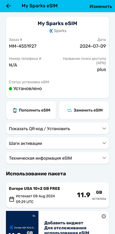 Надо сказать, что вот тут оно все заработало не сразу. Сначала приложение показывало, что eSIM неактивна, хотя она была подключена, потом как-то само активизировалось и стало показывать подключение 5G, но при этом к интернету не подключалось, я даже связался со службой поддержки, но пока я им отправлял скриншоты настроек, оно все прочухалось и заработало - видимо, требовалось несколько минут для активации.