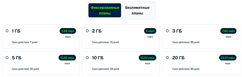Здесь, наверное, одни из самых дешевых тарифов. Причем, например, пакет EU 60 GB Unlimited Calls дает и 60 ГБ всего за €41 (€0,68 за гиг) плюс еще и неограниченные звонки!
