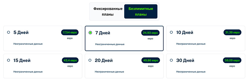 А вот нелимитированные: 7 дней €25 - это примерно €2 за гиг, что для анлима - отлично!