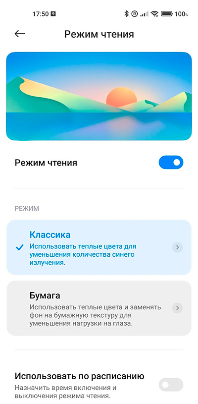 Также практически всегда у режима чтения кроме различных вариантов подстроек есть еще включение и выключение по расписанию - например, в вечернее время.