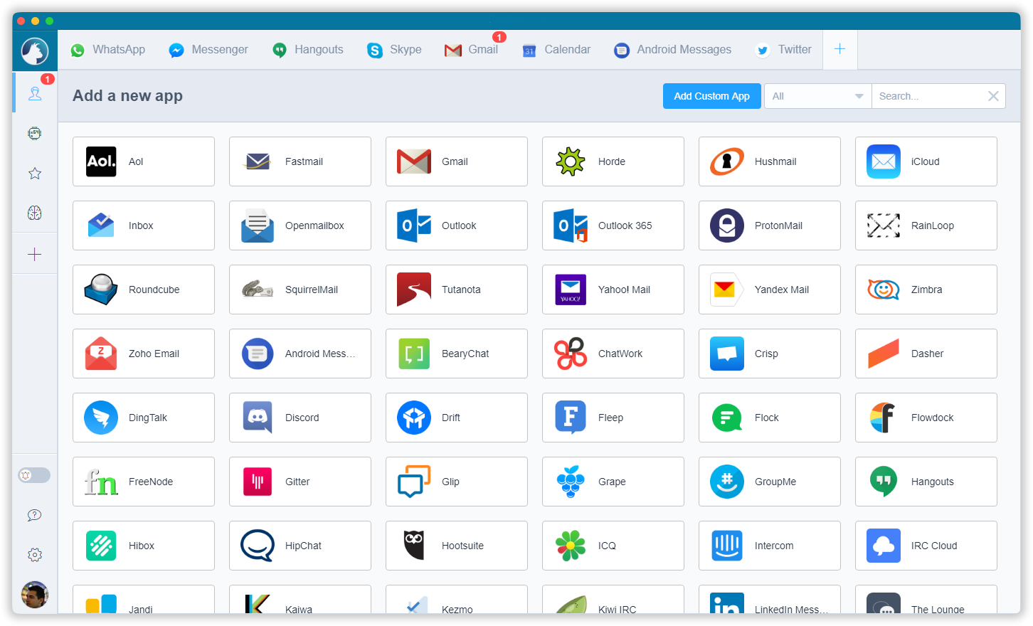 Также упоминали Rambox, по мне так солиднее выглядит wavebox.io, пользуюсь ими уже два года, пока еще не подводили. Он позволяет поставить любое расширение хрома, так что можно очень гибко под себя всё сделать.