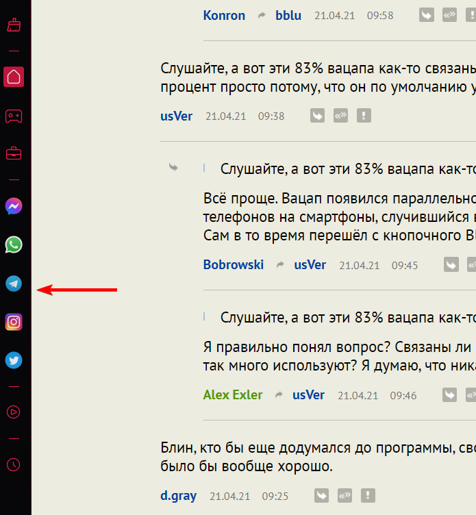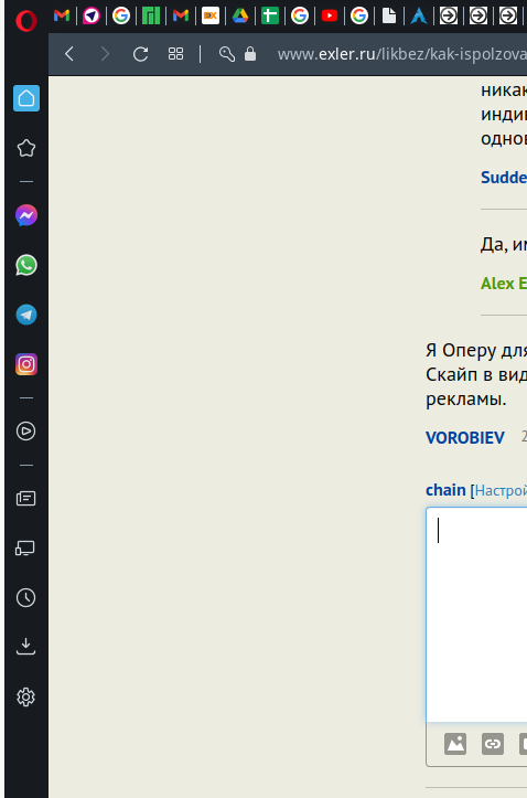 ну и в той же Опере "из коробки" уже есть встроенные версии телеграм, вацап и фейсбук мессенджер, и полюс ещё вконтакте, твиттер и инстаграм