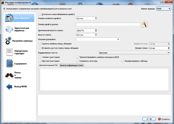 Далее можно задать всякие параметры конвертирования - сразу для всех выбранных книг, - однако лучше оставить все по умолчанию, если вы не понимаете, о чем идет речь. Если понимаете, там можно много чего настроить.