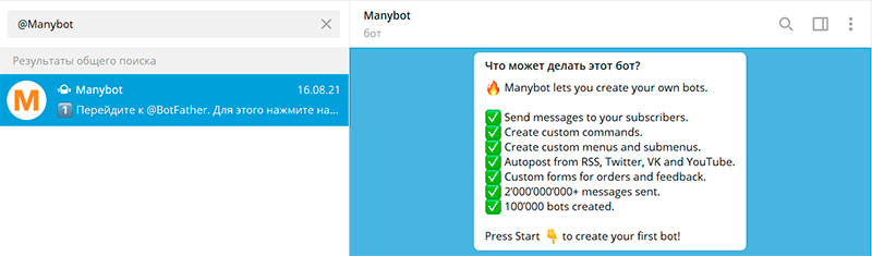 Для создания нового телеграм-бота в поиске приложения Telegram (в смартфоне или в клиенте на ПК) задайте аккаунт @Manybot и зайдите в него.