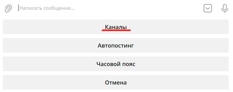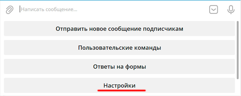 Заходим в канал бота, выбираем снизу (под строкой сообщения) настройки. (Если мы находимся в подменю команд, то переходим на самый верх через "Отменить".)