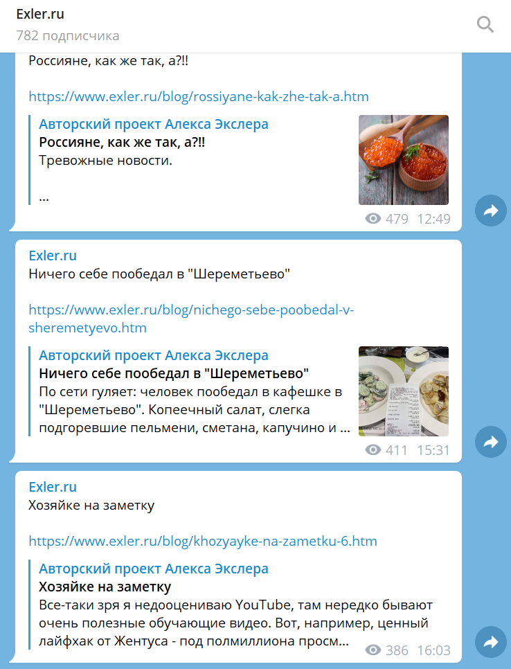 Кроме непосредственно контекстных телеграм-каналов, которые сейчас очень популярны, определенное количество подписчиков используют телеграм-каналы в качестве получения анонсов о новых постах или статьях в тех проектах, которые они посещают. И если у вас есть какой-то проект, обновления которого публикуются через RSS-ленту, то вам имеет смысл завести телеграм-канал с подобными постингами, потому что часть ваших читателей наверняка захотят получать сведения об обновлении именно через телеграм-канал.
