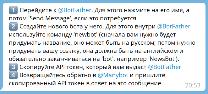 Нажимаем на команду "Добавить нового бота". Manybot выдаст следующее сообщение.