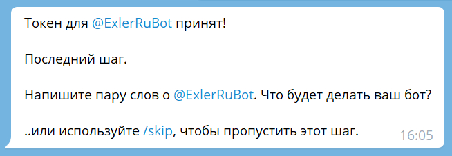 После того как вы в окне Manybot введете выданный вам токен, ваш телеграм-бот будет создан. Manybot предложит дать ему описание, но вы можете не делать этого, введя команду "/skip".