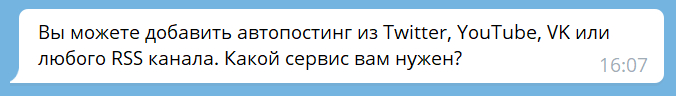 Можно наладить постинг обновлений из YouTube или из любой RSS-ленты (лента есть в том числе в Twitter и VK). Нажимаете на нужный пункт, вводите адрес RSS-потока.