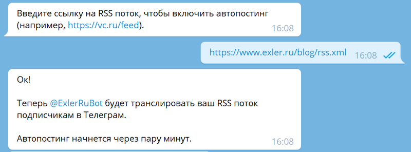 Вводим имя канала по указанной схеме - и получаем сообщение о том, что автопостинг подключен.