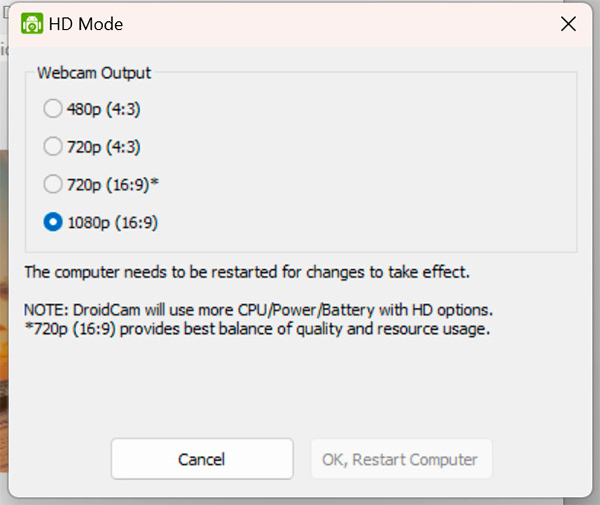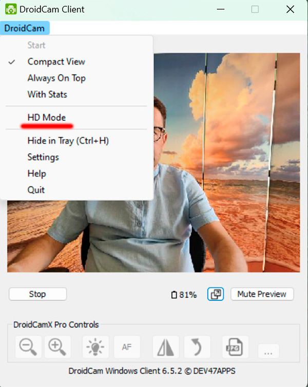 Настройка качества изображения делается в разделе HD Mode меню DroidCam.