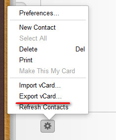 Нажимаем на пиктограмму настроек и там выбираем Export vCard - это экспорт контактов в формате электронных визитных карточек.