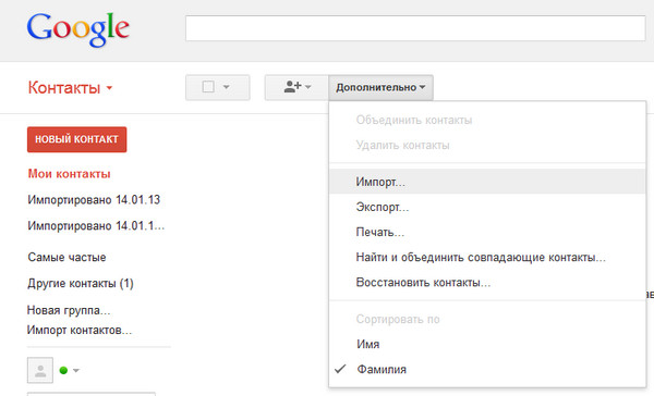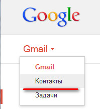 Заходим в свой Gmail, выбираем по кнопке Gmail слева сверху пункт "Контакты".